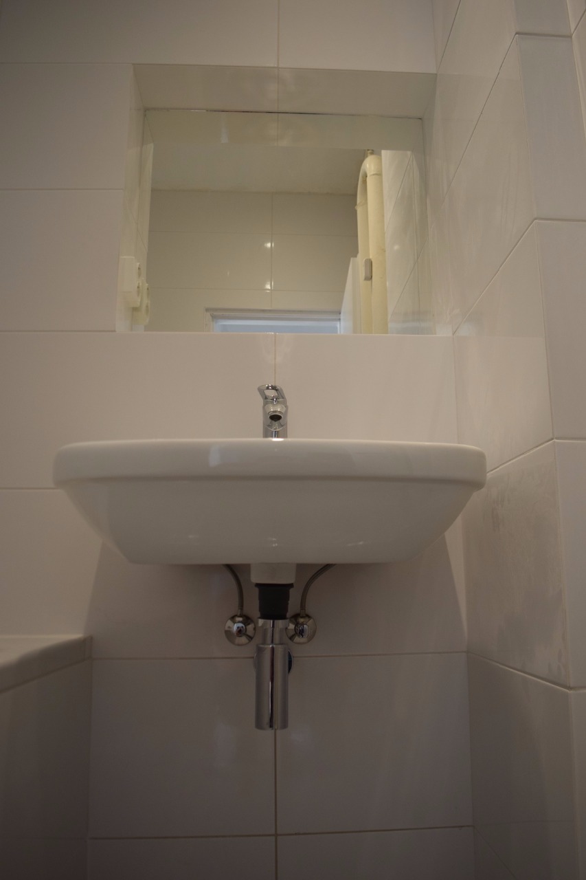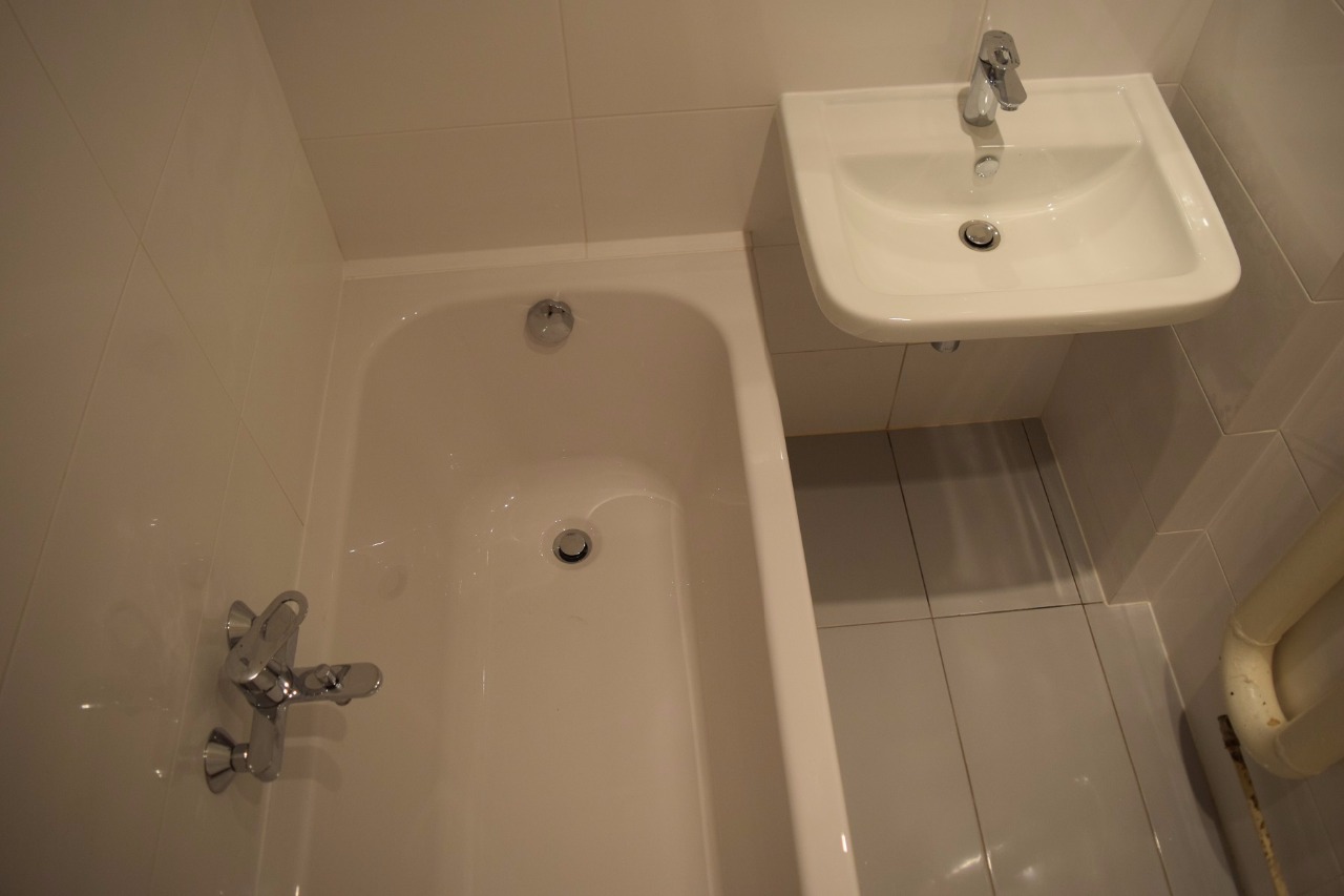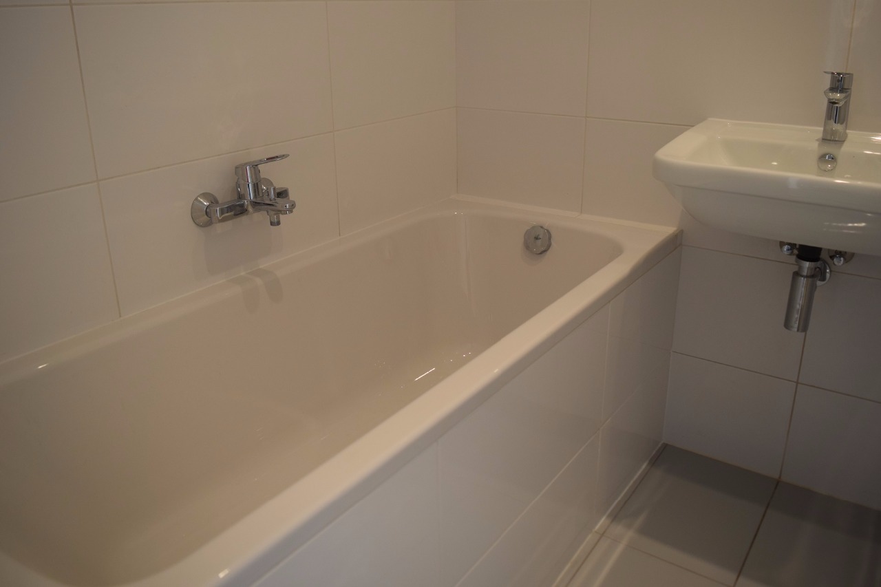 Půdorys koupelny byl upraven, aby lépe odpovídal dnešním požadavkům moderní rodiny. V koupelně je nová vana dlouhá 160 cm s krásným obdélnikovým umyvadlem s nikou a zrcadlem a kvalitními německými bateriemi od Grohe. Koupelna má samostatné velké otopné tělěso. Toaleta je samostatná a je v ní nově vybudované závěsné WC (Geberit) se sedátkem Soft close. Dále je vedle toalety malá místnost, která může sloužit jako šatna, nebo jako práčovna - jsou zde také nové rozvody vody a odpadu pro případnou pračku. V těchto třech místnostech je na podlaze kvalitní dlažba Rako, v koupelně a na toaletě jsou keramické obklady od stejné firmy.
