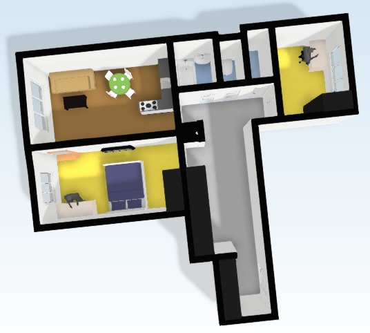 Dispozice byt je naprosto ideální pro menší rodinu s jedním, nebo dvěma dětmi. Byt disponuje jednou menší a jednou větší ložnicí (cca 9 a 18 m2). Díky vysokým stropům je možné vyuižít patrovou dětskou postel a také mít více uložných prostor v pokojích i v hale.